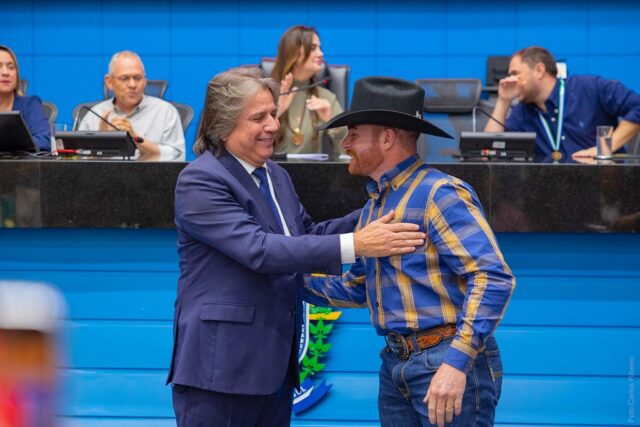 Durante a cerimônia, os homenageados surpreenderam o parlamentar ao instituí-lo como Patrono dos Rodeios do Mato Grosso do Sul, em reconhecimento ao apoio e à trajetória ligada ao segmento.